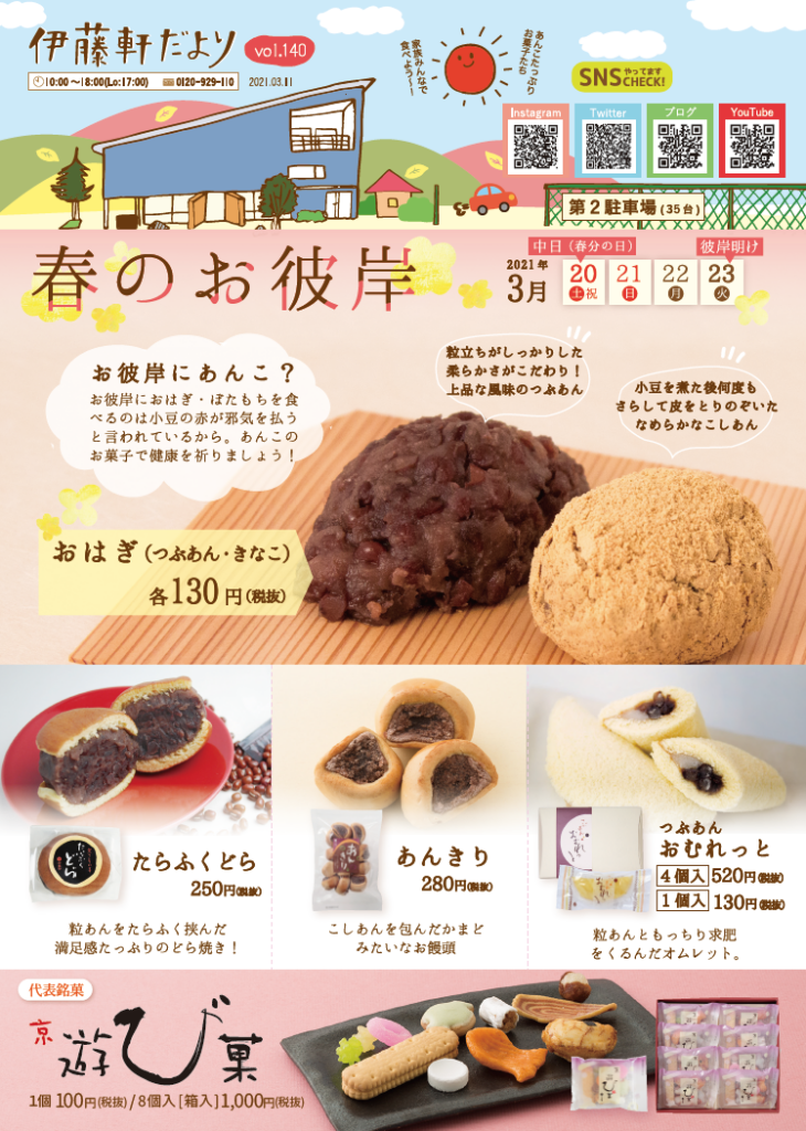 伊藤軒だより140号を発行いたしました。 ・春のお彼岸♪あんこたっぷりお菓子たち! ・お彼岸の贈り物やホワイトデーにぴったり。ギフト用にいかがでしょうか? …などなど盛りだくさんで、皆様のご来店をお待ちしております♪ 菓寮伊藤軒【営業時間 10:00〜18:00】 飲食カフェタイム 10:00-11:00 (L.O.10:45) 14:00-18:00 (食べ物 L.O.17:00 / 飲み物 L.O.17:30)