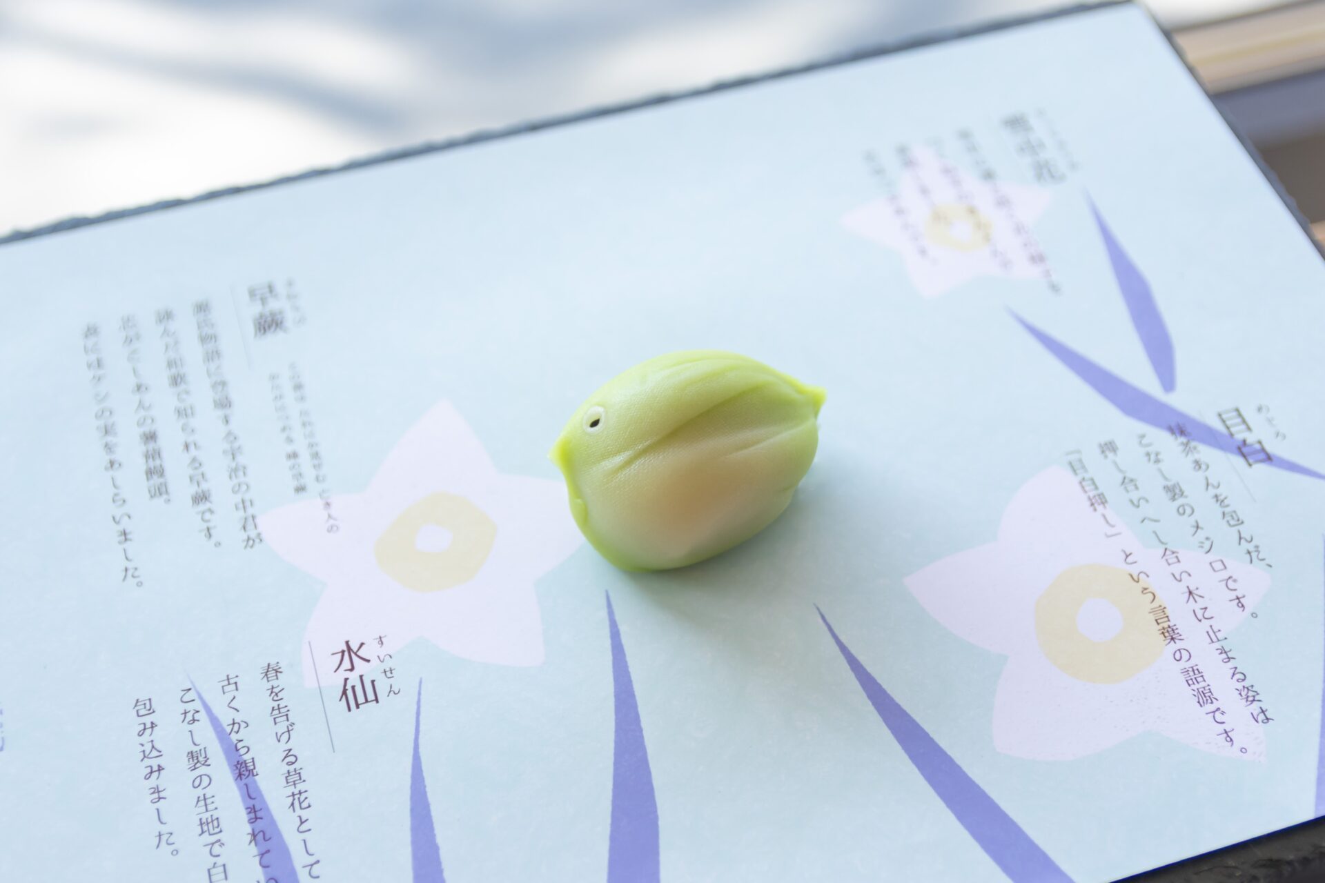 抹茶あんを包んだ、こなし製のメジロです。